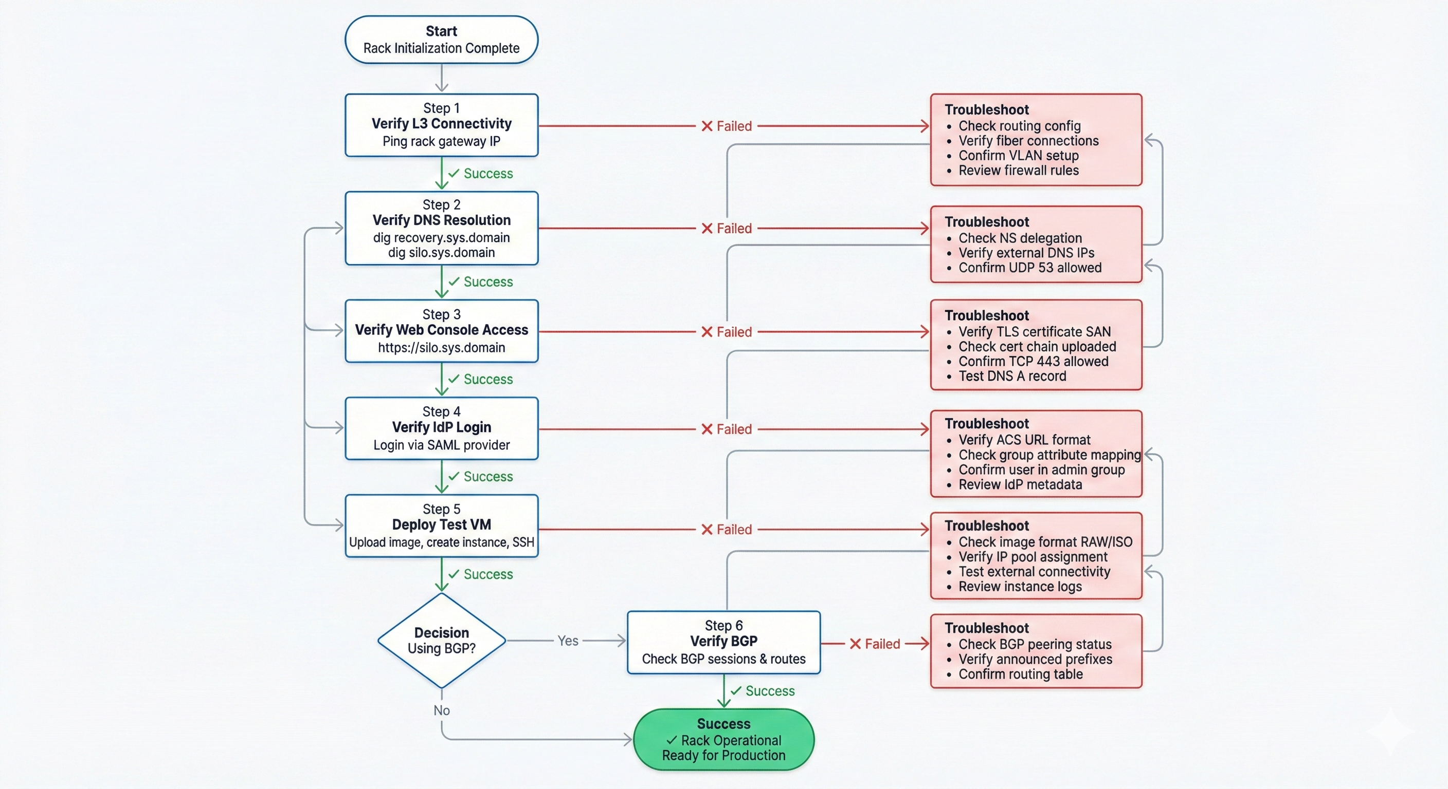 After completing silo and IP pool setup, walk through the following checks to confirm the rack is fully operational.